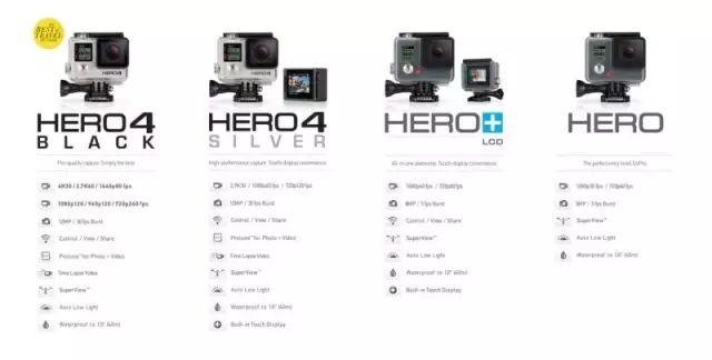GoPro的Hero系列一直是这家公司的当家花旦,按时间次序主要包括HD Hero、Hero2、Hero3、Hero3+、Hero4等系列。Hero初期只有一款相机,但会根据不同的运动搭配不同配件进行捆绑售卖,如Heor2系列就包括Outdoor版、Motorsports版和Surf版。
