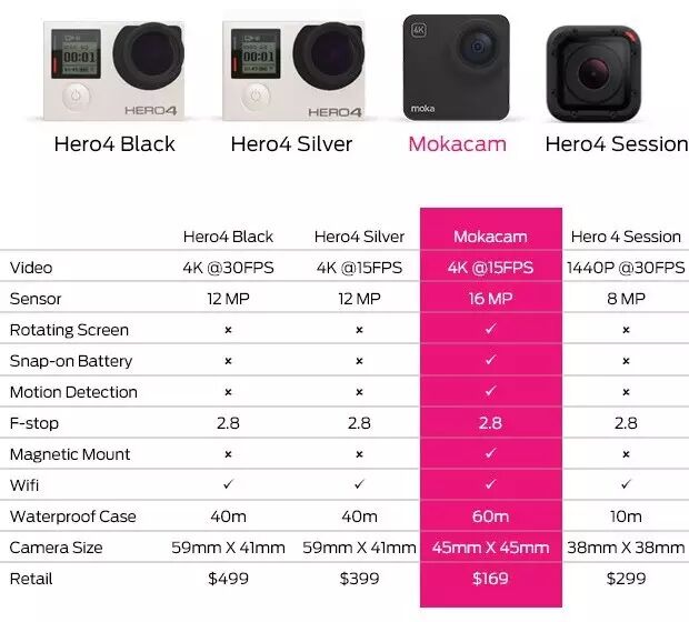 Mokacam号称当前市面上最小的4K运动相机,其尺寸仅为45mm×45mm。虽然GoPro Hero 4 Session的体积更小,但它最高分辨率只有1440P。Mokacam拥有1600万像素传感器,高于GoPro系列的1200万像素(Hero 4)和800万像素(Hero 4 Session)。同时,其配置的防水盒最大工作深度高达60米,高于GoPro的40米。此外,Wi-Fi功能、APP控制、和超广角镜头等运动相机的标准配置也是一样不缺。